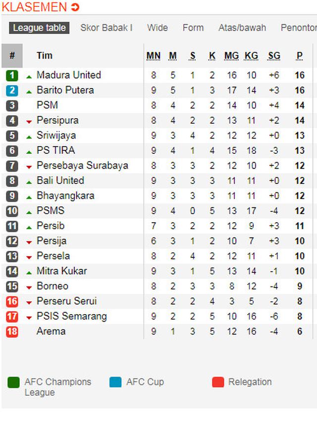 Persib bandung menghadapi runner up klasemen sementara shopee liga 1 2019 di stadion si jalak harupat jumat 2672019. Klasemen dan top score liga 1 gojek traveloka terbaru. Perseru serui membuka keran golnya ke gawang persebaya pada.